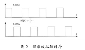 該電路主要由勵(lì)磁時(shí)序發(fā)生單元、三態(tài)緩沖器及隔離光耦組成。勵(lì)磁時(shí)序由水箱排水流量計(jì)系統(tǒng)的控制核心產(chǎn)生。采用DSP的EPWM外設(shè)模塊,通過(guò)設(shè)定其內(nèi)部定時(shí)器的工作模式發(fā)出所要求的勵(lì)磁頻率的勵(lì)磁時(shí)序PWM信號(hào)CT_1和CT_2。由于勵(lì)磁控制系統(tǒng)中的勵(lì)磁工作電源的電壓要比DSP的工作電源電壓高得多,為防止勵(lì)磁電路故障對(duì)系統(tǒng)控制核心產(chǎn)生致命影響,采用光耦將控制部分與勵(lì)磁部分進(jìn)行隔離。另外,由于DSP引腳的驅(qū)動(dòng)能力有限,所以在DSP與隔離光耦之間加入三態(tài)緩沖器以驅(qū)動(dòng)隔離光耦的輸入級(jí)。并且,DSP能夠通過(guò)GPIO口控制三態(tài)緩沖器上的使能引腳來(lái)使能和禁止勵(lì)磁,以在檢測(cè)到電路故障時(shí)迅速關(guān)斷H橋所有橋臂。該勵(lì)磁時(shí)序產(chǎn)生電路通過(guò)軟件編程可產(chǎn)生如圖5所示的單頻矩形波。在實(shí)際應(yīng)用中,由于組成H橋的達(dá)林頓三*管與MOS管導(dǎo)通與關(guān)斷的時(shí)間不一致,易在勵(lì)磁方向切換瞬間,產(chǎn)生上下橋臂同時(shí)導(dǎo)通的現(xiàn)象,反映在勵(lì)磁電流波形上為一幅值很高的窄脈沖。該脈沖電流不僅容易引起遲滯比較電路的誤輸出,從而導(dǎo)致高低壓切換電路與電流旁路電路的誤動(dòng)作,而且對(duì)恒流控制電路產(chǎn)生沖擊,減小三端穩(wěn)壓芯片的使用壽命,同時(shí)還會(huì)產(chǎn)生EMC電磁干擾,給測(cè)量精度帶來(lái)影響。所以實(shí)際應(yīng)用時(shí),如圖5所示對(duì)方波勵(lì)磁時(shí)序添加死區(qū),可以明顯減小上述現(xiàn)象。