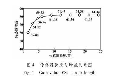 采用一臺日徑為6英寸、標(biāo)準(zhǔn)線圈的傳感器,改變傳感器長度,依次進行試驗室標(biāo)定試驗。傳感器長度與增益的關(guān)系圖如圖4所示。當(dāng)傳感器長度為9. 1英寸時,其增益為61. 03;但當(dāng)其長度繼續(xù)增加時,增益變化較小;當(dāng)其長度6. 1英寸減小到0時,增益從59. 33開始下降。也就是說,當(dāng)傳感器長度為6. 1-9. 1英寸時,既有效利用了線圈產(chǎn)生的磁場,又可使傳感器長度較短。