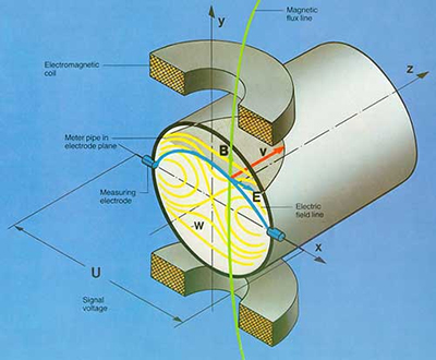 據(jù)法拉*電磁感應(yīng)定律,測(cè)量管道內(nèi)的流動(dòng)的導(dǎo)電液體(等效于許多連續(xù)的導(dǎo)電薄圓盤(pán))做垂直于磁場(chǎng)的運(yùn)動(dòng),產(chǎn)生感應(yīng)電動(dòng)勢(shì),電勢(shì)大小與流量相關(guān)。