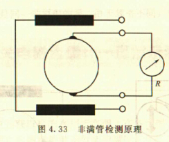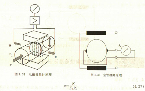 非滿管檢測也是基于電導(dǎo)率檢側(cè)的方法。在圖4.33所示的電磁流量傳感器中,增加了一個(或一對)非滿管檢測電*。當導(dǎo)管內(nèi)液體滿管時,頂部電*與其他電*之間的電阻值很小;而當存在非滿管情況時,頂部電*與導(dǎo)電液體之間有氣體阻隔,所以電*電阻顯著增大,從而做出非滿管判斷。