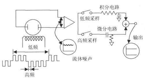 一個(gè)由高低頻分量迭加而成的電磁場(chǎng)通過(guò)勵(lì)磁線圈被施加到被測(cè)液體中, 勵(lì)磁波形是在一個(gè)低頻矩形波上迭加一個(gè)高于市電頻率的矩形波而得到的波形。在產(chǎn)生的電動(dòng)勢(shì)中, 低頻分量通過(guò)一個(gè)大時(shí)間常數(shù)的積分電路獲得一個(gè)零點(diǎn)穩(wěn)定性好的平穩(wěn)流量信號(hào)。而由漿液或低電導(dǎo)率流體產(chǎn)生的低頻噪聲可被不受噪聲影響的高頻采樣電路所抑制, 有著同樣時(shí)間常數(shù)的流量信號(hào)經(jīng)過(guò)一個(gè)差分電路以確定流速信號(hào)的變化, 把這兩種不同頻率采樣所得的信號(hào)結(jié)合起來(lái)可獲得一個(gè)穩(wěn)定流速信號(hào), 該信號(hào)不受噪聲干擾, 且有較高的零點(diǎn)穩(wěn)定性。