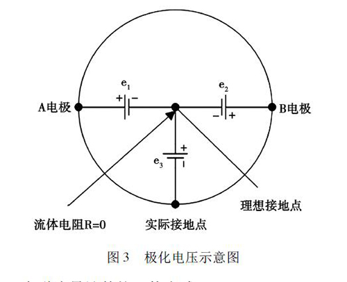 在被測液體與電*和接液部件接觸過程中,電解質(zhì)中的正負離子會分別作定向運動,這會使被測液體在電*和接液部件之間形成電位差,通常將這種現(xiàn)象稱為*化現(xiàn)象。如圖3 所示,理論上來說,兩電*A 和B 對接液部件的電位e1、e2大小相等、方向相反,此時兩電*的電位差等于零。但是,若兩電*的材質(zhì)或表面狀態(tài)存在差異,此時A、B 電*之間的電位差就不為零,這就形成了*化電壓,*化電壓與共模狀態(tài)的電壓e3一起疊加在流量信號中,被輸入轉(zhuǎn)換器的差動放大器。當*化電壓過大,則會對差動放大器的輸入端造成較大影響,導(dǎo)致信號無法放大或流量信號的輸出波動過大,從而降低了粘土漿流量計的測量精度。