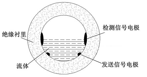 ③利用阻抗或信號衰減研制的非滿管氯化鐵流量計。這種結(jié)構(gòu)的非滿管氯化鐵流量計是當(dāng)前國內(nèi)研究的方向之一。其結(jié)構(gòu)是流量管底部貼一對信號發(fā)射電*,在流量管中間貼信號接收電*。由于信號在流體中傳播會產(chǎn)生衰減,且傳播時間越長,衰減越多,因此通過信號接收電*接收到的信號衰減量即可得知液面高度;同時該電*還能測量流體切割磁感線產(chǎn)生的電動勢,以此達(dá)到測量非滿管流量的目的。阻抗式或信號衰減非滿管氯化鐵流量計結(jié)構(gòu)簡圖如圖5所示。