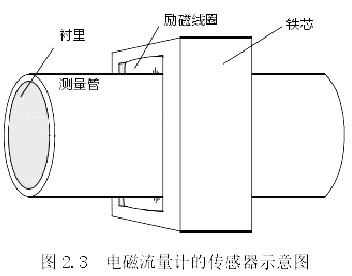傳感器的主要作用是將通過管道的流量信號(hào)進(jìn)行轉(zhuǎn)換,將其轉(zhuǎn)為電動(dòng)勢。市面上常見的傳感器主要有下圖 2.4 中如測量管、鐵芯、勵(lì)磁線圈、襯里等結(jié)構(gòu)。
