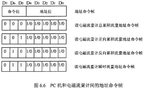 由于RS一485電氣標(biāo)準(zhǔn)規(guī)定每段只能聯(lián)結(jié)犯個(gè)節(jié)點(diǎn)設(shè)備,因此可用地址幀中五個(gè)二進(jìn)制位表示這32個(gè)地址,其余3位用來表示命令,從而構(gòu)成地址命令幀。對于控制命令需求不超過八個(gè)的通信系統(tǒng),采用地址命令幀可壓縮報(bào)文長度提高通信效率。在污水網(wǎng)絡(luò)監(jiān)控系統(tǒng)中,硫酸流量表和PC機(jī)通信的主要目的是將流量計(jì)中的有用數(shù)據(jù)讀到PC機(jī)中。這些數(shù)據(jù)包括:總累積流量、正向累積流量、反向累積流量、瞬時(shí)流量。通信時(shí),PC機(jī)只需向硫酸流量表發(fā)送讀總累積流量、讀正向累積流量、讀反向累積流量、讀瞬時(shí)流量命令即可,因此二者間通信所用的地址幀和命令幀可合二為一,用一個(gè)地址命令幀代替。PC機(jī)和硫酸流量表間的地址命令幀定義如圖.66所示。根據(jù)污水網(wǎng)絡(luò)監(jiān)控系統(tǒng)中PC機(jī)與硫酸流量表間通信的特殊性,二者通信所使用的報(bào)文可簡化為圖.67的格式。