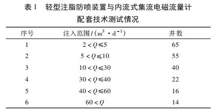 在實(shí)際應(yīng)用中,使用輕型注脂防噴裝置與內(nèi)流式集流氫氧化鈉流量計(jì)配套技術(shù)對(duì)喇叭口在射孔層上注聚井進(jìn)行測(cè)試。輕型注脂防噴裝置與內(nèi)流式集流氫氧化鈉流量計(jì)配套技術(shù)施工工藝參見(jiàn)文獻(xiàn),測(cè)試情況見(jiàn)表 1 所示,低注入量井( ≤10 m3 /d) 占到 56. 60% 。
