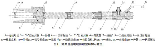 注入剖面測(cè)試中,溢流量對(duì)測(cè)量結(jié)果影響至關(guān)重要。如圖 1 所示,測(cè)井普通防噴盒采用 3 級(jí)密封: * 1 級(jí)密封為阻流管( 6) ,測(cè) 20 井次左右阻流管內(nèi)徑變大,溢流量增加; * 2 級(jí)為橡膠盤(pán)根和鋼墊( 15) ; * 3 級(jí)為橡膠盤(pán)根( 10) ,調(diào)整壓帽( 11) 松緊程度,橡膠盤(pán)根抱緊電纜; * 2 級(jí)和* 3 級(jí)密封更換一次橡膠盤(pán)根測(cè)試 3 ~ 5 井次溢流量增加。普通防噴盒無(wú)法實(shí)現(xiàn)溢流量,沒(méi)有捕捉器、防噴器和放噴組裝件。普通電纜防噴裝置工作壓力20 MPa,耐壓 40 MPa。