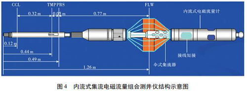 1. 2 內(nèi)流式集流氫氧化鈉流量計(jì)如圖 4 所示,內(nèi)流式集流電磁組合測(cè)井儀主要采用內(nèi)流式集流氫氧化鈉流量計(jì),并組合了井溫壓力磁定位儀。利用電磁感應(yīng)原理測(cè)量平均流速,體積流量計(jì)算公為: