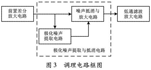 根據(jù)前饋控制的自適應*化噪聲抵消原理,設計了信號調理電路2,以實現(xiàn)*化噪聲的濾除。信號調理電路2主要包括前置差分放大電路、*化噪聲提取與抵消電路、低通濾波放大電路三部分。調理電路如圖3所示。