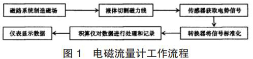 酸堿液計(jì)量表的產(chǎn)生主要是基于法拉*電磁感應(yīng)定律。在酸堿液計(jì)量表的應(yīng)用中,磁路系統(tǒng)會(huì)在流量計(jì)運(yùn)行過(guò)程中逐步出現(xiàn)直流磁場(chǎng)與交流磁場(chǎng),該磁場(chǎng)的產(chǎn)生為后期的測(cè)量提供了良好的前提條件,營(yíng)造了測(cè)量所需的磁場(chǎng)環(huán)境,因此,在酸堿液計(jì)量表應(yīng)用時(shí),一旦被測(cè)液體在導(dǎo)管中經(jīng)過(guò)該磁場(chǎng)環(huán)境時(shí),必然會(huì)產(chǎn)生一定的切割磁力線(xiàn)運(yùn)動(dòng),在這種情況下,電*傳感器就會(huì)發(fā)揮其作用,將導(dǎo)管內(nèi)的流量轉(zhuǎn)換為感應(yīng)電勢(shì)信號(hào),隨后此轉(zhuǎn)換形成的信號(hào)逐步被傳遞給轉(zhuǎn)換器。而轉(zhuǎn)換器更是可以將所獲得的流量信號(hào)等加以處理,通過(guò)分析、對(duì)比等,轉(zhuǎn)換器會(huì)將該信號(hào)變?yōu)闃?biāo)準(zhǔn)信號(hào),隨后將該信號(hào)輸出給積算儀,進(jìn)一步進(jìn)行信號(hào)的處理,這些處理以后的信號(hào)*終會(huì)在酸堿液計(jì)量表的儀表中顯示,呈現(xiàn)*終的流量測(cè)量結(jié)果,其基本的流程如圖 1 所示。