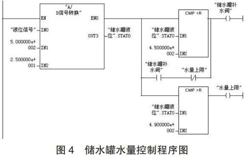 (2)程序設(shè)計(jì)。儲(chǔ)水罐水量控制的工作過(guò)程為:當(dāng)壓力變送器檢測(cè)到儲(chǔ)水罐的水量低于 450kg 時(shí),補(bǔ)水閥 3 開(kāi)啟為儲(chǔ)水罐補(bǔ)水;當(dāng)水量達(dá)到 490kg 時(shí),補(bǔ)水閥 3 關(guān)閉;生產(chǎn)配制過(guò)程中,循環(huán)以上控制過(guò)程。儲(chǔ)水罐水量控制的程序如圖 4 所示。