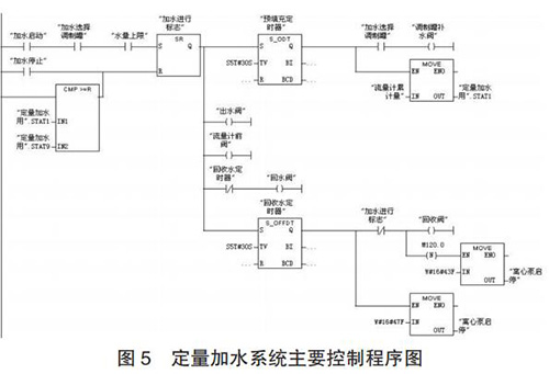 定量加水系統(tǒng)的工作過(guò)程為:當(dāng)設(shè)定好加水量后,啟動(dòng)系統(tǒng),多級(jí)離心泵 10、回流閥 4、出水閥 9 和流量計(jì)前閥 12開(kāi)啟對(duì)管路進(jìn)行預(yù)填充;延時(shí) 30s 預(yù)填充完成后,回流閥 4關(guān)閉,調(diào)制罐補(bǔ)水閥 14 開(kāi)啟,同時(shí)質(zhì)量流量計(jì) 13 開(kāi)始計(jì)量;當(dāng)質(zhì)量流量計(jì)的累積量與設(shè)定加水量一致時(shí),出水閥 9 和調(diào)制罐補(bǔ)水閥 14 關(guān)閉;調(diào)制罐定量加水完成后,開(kāi)啟回收閥17 和回流閥 4 以及同未關(guān)閉流量計(jì)前閥 12 一起,利用壓縮空氣對(duì)管道中水實(shí)現(xiàn)回收;延時(shí) 30s 水回收完成后,關(guān)閉多級(jí)離心泵、球閥 4、12 和 17,定量加水過(guò)程完成。定量加水系統(tǒng)主要控制程序如圖 5 所示。