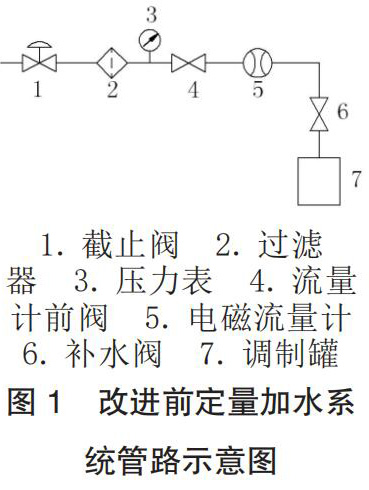 工廠的香料廚房系統(tǒng)為國(guó)內(nèi)煙機(jī)公司 2004 年設(shè)計(jì)制造,其定量加水系統(tǒng)主要由水源、智能法蘭式電磁流量計(jì)、加水管路元件和控制程序這四部分組成,改進(jìn)前管路示意圖如圖 1 所示。