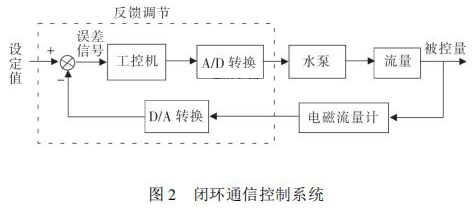 通信控制系統(tǒng)由工控機(jī)、變頻器、水泵、數(shù)據(jù)采集卡、潛水電磁流量計等組成。在整個熱量表耐久性試驗(yàn)裝置中,潛水電磁流量計與被試驗(yàn)熱量表串聯(lián)在試驗(yàn)管路中。系統(tǒng)設(shè)定流量值 qs,通過工控機(jī)發(fā)送信號給變頻器,來控制水泵運(yùn)轉(zhuǎn),系統(tǒng)通過研華數(shù)據(jù)采集卡 PCI1711 將采集到的潛水電磁流量計當(dāng)前瞬時流量值反饋給工控機(jī),工控機(jī)將返回流量值與設(shè)定流量值qs進(jìn)行比較,從而確定是否需要重新調(diào)整變頻器頻率控制水泵轉(zhuǎn)速。此過程是一個完整的閉環(huán) PID 控制過程,其閉環(huán)控制過程如圖 2 所示。 2. 2 管路切換系統(tǒng)管路切換主要由冷熱水箱、水泵、開關(guān)閥等組成。要實(shí)現(xiàn)熱量表耐久性 4000 次冷熱沖擊試驗(yàn),需要實(shí)時控制管路中熱水與冷水的交替使用。