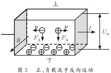 反之,如圖2所示,若載流子帶負電荷,則載流子在洛倫茲力作用下會向下偏轉(zhuǎn),導體下表面積累負電荷。同時,上表面失去負電荷而帶上正電,從而使上表面電勢高于下表面。