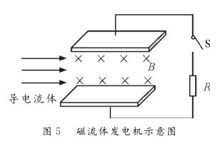 【例1】圖5為磁流體發(fā)電機示意圖。設兩金屬板間的距離為d,兩*板間勻強磁場的磁感應強度為B。等離子體垂直進入磁場的速度為v,單個離子所帶的電荷量為q。離子通道(即兩*板內(nèi)所圍成的空間)的等效電阻為r,負載電阻為R。則下列判斷正確的是( )