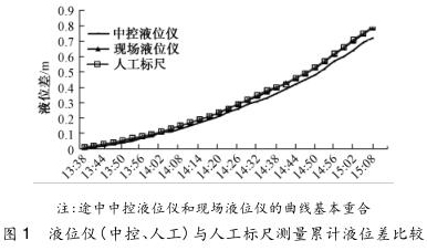 液位的測量是整個容積法校驗的重點,其準確度直接關乎計量結果。由于液位儀信號非數(shù)字傳輸,在測量過程中安裝了人工標尺這一液位簡易測量裝置,供校核液位儀使用。將測量的累計液位差同液位儀(中控、現(xiàn)場)測得數(shù)據(jù)進行比較,如圖 1 所示。