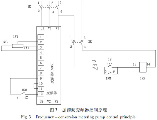 STD - Ⅲ型浮選工藝參數(shù)自動(dòng)測(cè)控系統(tǒng)通過(guò)雙膜盒差壓計(jì)測(cè)量原礦漿濃度; 采用鹽水流量計(jì)測(cè)量原礦漿流量,由 PLC 計(jì)算出入浮干煤泥量和藥劑的瞬時(shí)添加量,用變頻式計(jì)量泵完成浮選藥劑的添加。通過(guò)上位機(jī)還可以打印小時(shí)、班、天及月的運(yùn)行數(shù)據(jù),更加有利于生產(chǎn)管理及技術(shù)分析,藥劑自動(dòng)原理如圖 2 所示,k1、k2、k3 是計(jì)算修正參數(shù)。以 PID 算法為核心,通過(guò)優(yōu)化控制程序計(jì)算出藥劑給定量,在捕收劑和起泡劑管道上分別安裝藥劑測(cè)量裝置,用于檢測(cè)藥劑的添加量。當(dāng)藥劑測(cè)量值小于藥劑給定量時(shí),PID 輸出增大,反之則減小。加藥泵變頻器控制原理如圖 3 所示。