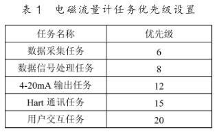 下面以電磁流量計為例說明基于 μC/OS-III 的人機(jī)界面設(shè)計。 先將 μC/OS-III 移植到 Cortex-M3 處理器上,這里選用的是 STM32F103VET6 。電磁流量計的應(yīng)用程序若按照上節(jié)的任務(wù)種類劃分有: 數(shù)據(jù)采集任務(wù)、數(shù)據(jù)處理任務(wù), 4~20mA輸出任務(wù), Hart 通訊任務(wù)以及用戶交互任務(wù)。 先對不同的任務(wù)進(jìn)行優(yōu)先級的劃分,如表 1 所示。