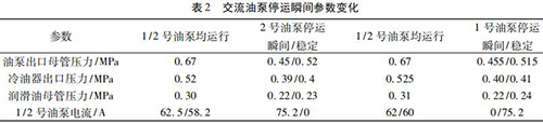 通過(guò)內(nèi)部旁通將冷油與熱油混合,經(jīng)過(guò)銅粉- 煤油 - 蠟感溫元件控制冷熱油混合比例,將油溫調(diào)節(jié)到 49 ℃。一臺(tái)氨水流量計(jì)穩(wěn)定運(yùn)行,油泵出口母管壓力 0. 5 MPa,潤(rùn)滑油母管壓力 0. 24 MPa,均屬于正常情況,而兩臺(tái)交流油泵并列運(yùn)行時(shí),停運(yùn)其中一臺(tái)交流油泵瞬間會(huì)觸發(fā)電磁流量計(jì)出口母管壓力開(kāi)關(guān)動(dòng)作,說(shuō)明停運(yùn)瞬間油壓發(fā)生波動(dòng),且油泵出口母管油壓波動(dòng)至小于 0. 45 MPa。正常運(yùn)行時(shí)電磁流量計(jì)出口油溫 71.5 ℃,冷油器出口溫度45 ℃,混合后潤(rùn)滑油母管溫度52.5 ℃,由能量守恒定律可知,經(jīng)過(guò)冷油器的油量/不經(jīng)冷油器的油量= ( 71.5-52.5) ÷ ( 52.5- 45) = 2. 53,說(shuō)明有 70% 左右的油量經(jīng)過(guò)冷油器。當(dāng) 2 臺(tái)氨水流量計(jì)運(yùn)行時(shí)油量大于單泵運(yùn)行,其中一臺(tái)電磁流量計(jì)瞬間停運(yùn)時(shí)油量減少,尤其是經(jīng)過(guò)冷油器的油量大量減少,油量在溫控閥二次分配過(guò)程中出現(xiàn)調(diào)節(jié)異常,導(dǎo)致油壓過(guò)大波動(dòng)。為檢驗(yàn)溫控閥工作情況,保持 1 號(hào)、2 號(hào)交流油泵運(yùn)行,選取機(jī)組正常帶負(fù)荷運(yùn)行時(shí)油溫 52 ℃,分別停運(yùn) 1、2 號(hào)交流油泵,觀察 1、2 號(hào)交流油泵停運(yùn)瞬間油泵出口母管壓力波動(dòng)情況,試驗(yàn)各參數(shù)變化見(jiàn)表 2。