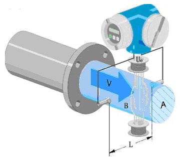 據(jù)法拉*電磁感應(yīng)原理,在與測量管軸線和磁力線相垂直的管壁上安裝了一對檢測電*,當(dāng)導(dǎo)電液體沿測量管軸線運(yùn)動時,導(dǎo)電液體切割磁力線產(chǎn)生感應(yīng)電勢,此感應(yīng)電勢由兩個檢測電*檢出,數(shù)值大小與流速成正比例,其值為: