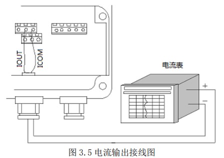 使用電流輸出線(4-20mA)時,應注意到導線的電阻與負載電阻之和不得大于 750Ω 。電流輸出接線見圖 3.5。