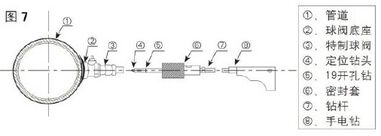 將密封墊圈放入已焊接好的底座中,再將特制球閥擰入,注意壓緊密封墊圈,防止漏水。將開孔器密封護(hù)套與球閥外螺紋連接。擰緊后,打開球閥,推動鉆桿直至與管道外壁接觸,將手電鉆與鉆桿接好鎖緊,接通電源,開始鉆孔。在鉆孔過程中電鉆保持低速,轉(zhuǎn)速不要過快、以免卡鉆,甚至鉆頭折斷。鉆透后,拔出鉆桿直到開孔器鉆頭的*前端退至球閥芯后,關(guān)上球閥,卸下開孔器。