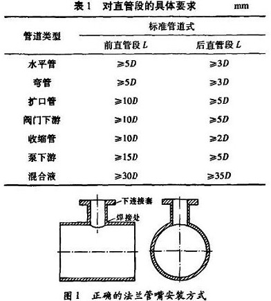 流體在方向、管徑以及閥門開度變化時,會產(chǎn)生渦流和流場畸變,這樣會對傳感器電*的測量產(chǎn)生影響,從而影響儀表的精度。所以要盡可能地離開彎管、手閥、調(diào)節(jié)閥等部件一定距離,直管段的具體要求見表1。表中,D表示管道通徑,L表示傳感器到閥門或彎頭等部件的距離。