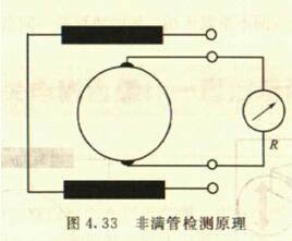 非滿管檢測(cè)也是基于電導(dǎo)率檢側(cè)的方法。在圖4.33所示的電磁流量傳感器中,增加了一個(gè)(或一對(duì))非滿管檢測(cè)電*。當(dāng)導(dǎo)管內(nèi)液體滿管時(shí),頂部電*與其他電*之間的電阻值很??;而當(dāng)存在非滿管情況時(shí),頂部電*與導(dǎo)電液體之間有氣體阻隔,所以電*電阻顯著增大,從而做出非滿管判斷。