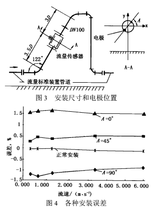 除儀表前直管段可降低彎管影響外,人們還從安裝方式上設(shè)法降低影響的方法。文獻(xiàn)曾報(bào)道電磁流量傳感器電*軸線與鄰近彎管平面成45°傾斜安裝可以減少?gòu)澒苡绊?。日本工業(yè)標(biāo)準(zhǔn)B7554“解說(shuō)部分”列有電*軸線與彎管平面垂直、平行、成45°三種安裝方式,在不同長(zhǎng)度直管下的測(cè)量誤差范圍,也說(shuō)明這一效果。