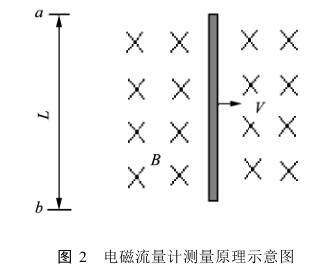 本文選用不同質(zhì)量濃度的煤泥在裝有電磁流量計(jì)的液壓與流變?cè)囼?yàn)臺(tái)上(實(shí)驗(yàn)原理如圖1)進(jìn)行管道輸送實(shí)驗(yàn)。電磁流量計(jì)根據(jù)電磁感應(yīng)原理測(cè)量流過(guò)管道中導(dǎo)電流體的流量,故使用電磁流量計(jì)的前提是被測(cè)流體必須導(dǎo)電,且電導(dǎo)率不能低于閾值(即下限值)。通用型電磁流量計(jì)的閾值在(5×10-6)S/cm~10-4S/cm之間,若電導(dǎo)率低于閾值會(huì)產(chǎn)生誤差甚至不能測(cè)量。根據(jù)電磁感應(yīng)原理(如圖2),當(dāng)導(dǎo)電流體在磁場(chǎng)強(qiáng)度為B的磁場(chǎng)中切割磁力線(xiàn)時(shí),在線(xiàn)形長(zhǎng)度為L(zhǎng)的a和b兩點(diǎn)之間會(huì)產(chǎn)生感應(yīng)電動(dòng)勢(shì),為