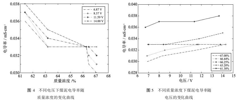 圖4的電導(dǎo)率變化曲線(xiàn)表明,隨著煤泥質(zhì)量濃度的增大,其電導(dǎo)率逐漸降低,并在質(zhì)量濃度為66%時(shí)相交于一點(diǎn);圖5的電導(dǎo)率變化曲線(xiàn)表明,隨著電壓的增大,電導(dǎo)率有逐漸增大趨勢(shì)。分析圖4與圖5可得到以下結(jié)論:
