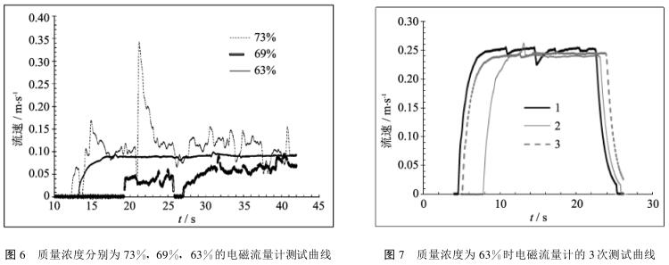 *先分析電磁流量計(jì)流速數(shù)據(jù)的重復(fù)性。圖6是當(dāng)管內(nèi)流速為0.1m/s(即濃密膏體輸送流速下限)時(shí),電磁流量計(jì)測(cè)量由大到小的3種質(zhì)量濃度分別為73%,69%,63%的煤泥的實(shí)時(shí)數(shù)據(jù)曲線(xiàn)。由圖可見(jiàn)濃度較高時(shí)電磁流量計(jì)難以測(cè)出穩(wěn)定的流速數(shù)值,而當(dāng)濃度較低且煤泥流動(dòng)性非常好時(shí)測(cè)量數(shù)值較為穩(wěn)定。圖7是質(zhì)量濃度為63%時(shí)電磁流量計(jì)的3次測(cè)試曲線(xiàn),可見(jiàn)其重復(fù)性良好,故測(cè)量結(jié)果可信。相比較煤泥電導(dǎo)率的測(cè)試結(jié)果,可以看出當(dāng)質(zhì)量濃度低于63%時(shí),電導(dǎo)率較大,且不同質(zhì)量濃度下電導(dǎo)率變化穩(wěn)定。故推測(cè)當(dāng)質(zhì)量濃度低于63%,電導(dǎo)率高于0.035mS/cm時(shí),電磁流量計(jì)應(yīng)用于煤泥管道輸送時(shí)數(shù)據(jù)準(zhǔn)確性較高。