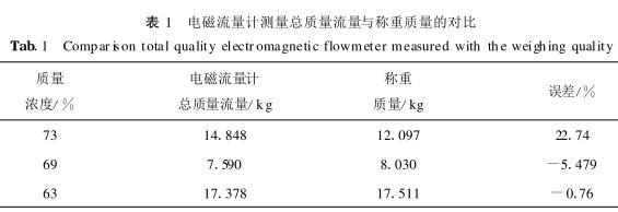其次提取電磁流量計(jì)的流速數(shù)據(jù)換算并積分后與稱(chēng)重質(zhì)量進(jìn)行對(duì)比,分析其數(shù)據(jù)誤差,結(jié)果如表1??梢酝ㄟ^(guò)電磁流量計(jì)積分后的總流量與稱(chēng)重?cái)?shù)據(jù)的吻合程度來(lái)分析,若二者吻合較好則說(shuō)明電磁流量計(jì)在線(xiàn)測(cè)量數(shù)據(jù)顯示雖然可能受到氣泡的影響,但是總流量可以準(zhǔn)確測(cè)量;若二者相差較大,則說(shuō)明電磁流量計(jì)不適合對(duì)較高質(zhì)量濃度煤泥進(jìn)行測(cè)量。從表1可以看出電磁流量計(jì)在質(zhì)量濃度為69%,73%時(shí)誤差較大,故測(cè)量不準(zhǔn)確;在質(zhì)量濃度為63%時(shí)測(cè)量誤差較小,說(shuō)明其測(cè)量較準(zhǔn)確。該對(duì)比實(shí)驗(yàn)與之前的重復(fù)性分析相符,說(shuō)明用質(zhì)量濃度及電導(dǎo)率來(lái)評(píng)價(jià)電磁流量計(jì)測(cè)量數(shù)據(jù)的準(zhǔn)確性有一定的可行性。