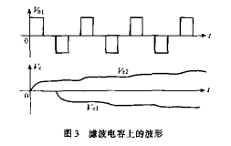 應(yīng)該指出的是RC濾波對(duì)方波信號(hào)也起延緩作用,但經(jīng)過(guò)七個(gè)周期的方波之后,電容上的電壓與方波的實(shí)際峰值誤差只有0.02%。電容上的波形與V01的波形如圖3所示。