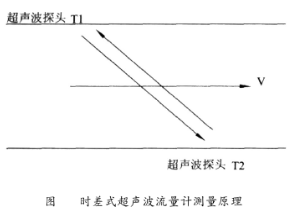 時差式超聲波流量計用于測量流體流速對雙向聲波信號的影響。它的兩個換能器探頭(T1、T2)以一定的間距安裝在管壁外側,交替發(fā)射和接收超聲波。當超聲波在靜止的流體中傳播時,從T1到T2的聲波信號傳送時間與從T2到T1的傳送時間相同;當流體流動時,上游換能器T1向下游換能器T2發(fā)射一個信號,同時下游也向上游發(fā)射信號,由于流體流速對超聲波信號的作用,加快從上游到下游方向的信號傳播速度,同時減慢從下游到上游方向的信號傳播速度,兩個信號之間產(chǎn)生了時間差。由此求得流體的流速,再與圓管的流通截面積相乘計算出流量。流體流速的基本計算公式: