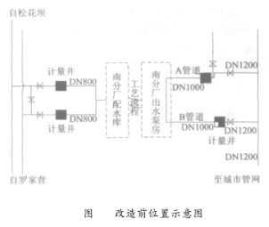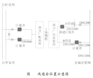 根據(jù)上述分析及現(xiàn)場勘測發(fā)現(xiàn):昆明市*五自來水廠出水A管道時差式超聲波流量計安裝位置下游長度不滿足要求,在探頭安裝位置下游附近管道管徑由1.0m變?yōu)?.2m,并且接有一根DN200的支管。因此在供水高峰期時,此段由于三通、閥門影響,水流易產(chǎn)生紊流、渦流從而產(chǎn)生氣泡,大大減小聲波信號的強度,致使時差式超聲波流量計出現(xiàn)信號中斷。通過在探頭位置靠近出水泵房一側移動7m挖計量井,其位置滿足上下游直管段長度要求,利用便攜式超聲波流量計在此位置進行水流計量檢驗,其結果信號良好。由此說明先前探頭安裝直管段長度不滿足要求造成信號中斷。時差式超聲波流量計位置見圖4。